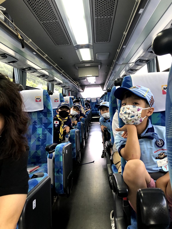 ビーバー隊はカブ隊のお兄ちゃんたちと一緒のバスに乗って出発です。
