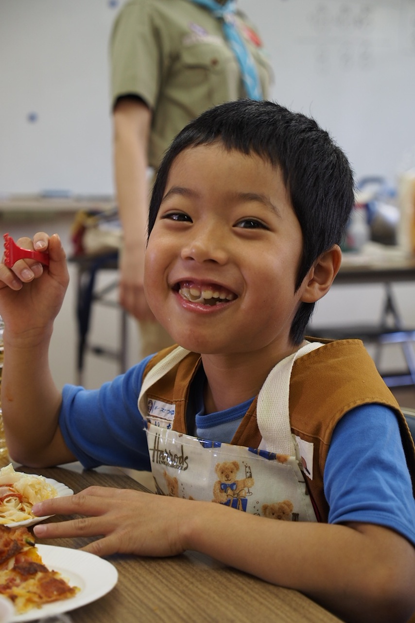 スカウト1:「この生地を宇宙全体と考えた場合、この端の星は我々から見るとどんどん広がっているためすごく早い速いスピードで遠のいているわけで、その場合星の光は引き伸ばされて赤い波長の方向に移動する。これを光の赤方偏移と読んでいるんだけど、このピザですべて説明できるね!」