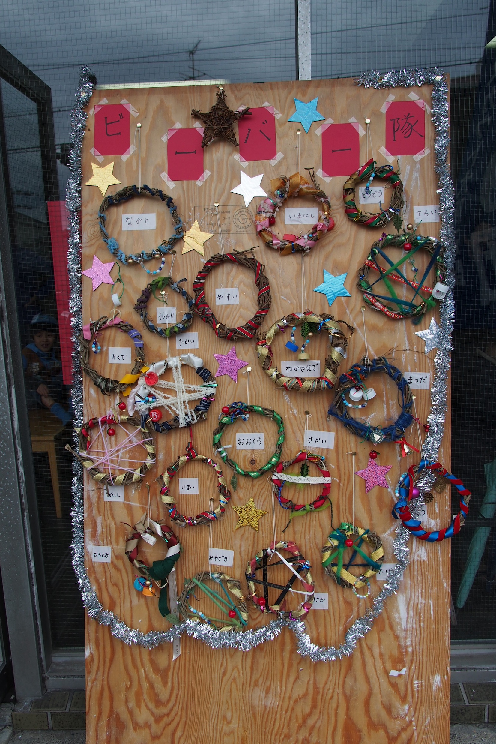 クラフトの時に作ったビーバーのクリスマスリースが、参加者をお出迎えします。