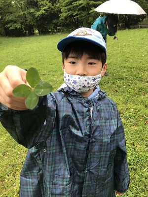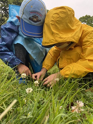 池での動物探しが終わったら、広場で四つ葉のクローバー探し。