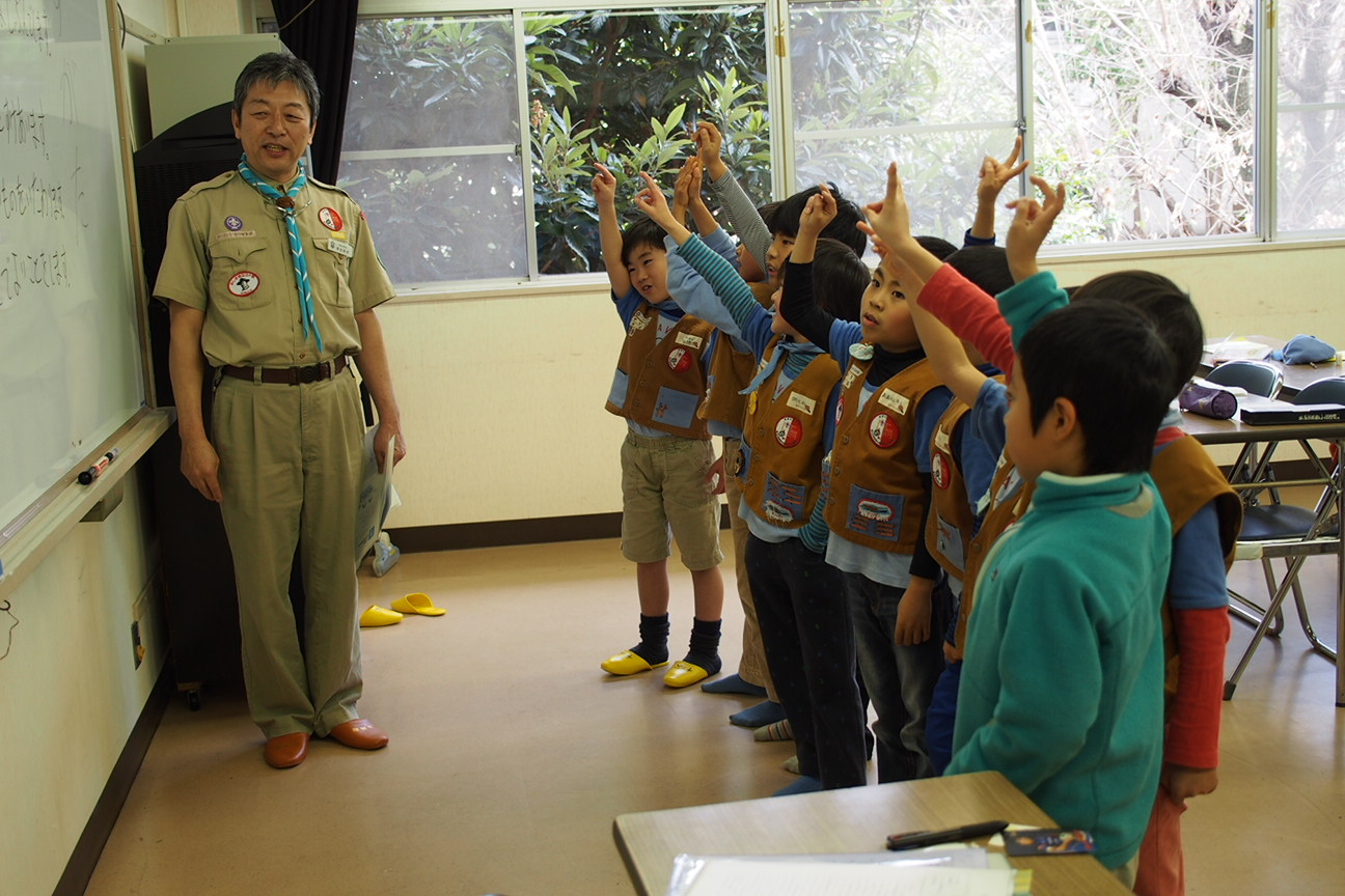 ビーバーの活動が終わったあとに、ビッグビーバーは来年度カブスカウトに上進するので、カブ隊の隊長からカブ隊の基本を色々教えていただきました(これをリスの道と呼ぶそうです)。