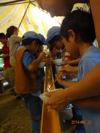 さあ メインイベント!ソーメン流しのはじまりです。団委員の田村さん 水野ボーイ隊長 保護者のお父さんたちががんばってくれました。
